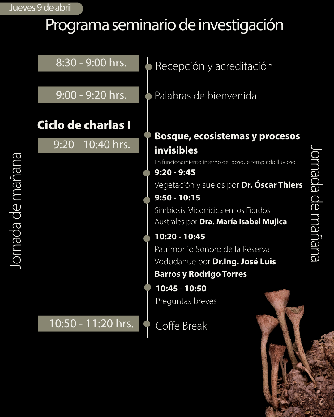 Se desarrollará desde las 9:00 hasta las 10:40 horas y estará enfocado en comprender el funcionamiento del bosque templado lluvioso. Este bloque contará con la participación del Dr. Óscar Thiers, quien presentará la charla “Vegetación y suelos”. Posteriormente, la Dra. María Isabel Mujica expondrá sobre “Simbiosis micorrícica en los fiordos australes”. El ciclo finalizará con la presentación “Patrimonio sonoro de la Reserva Vodudahue”, a cargo del Dr. Ing. José Luis Barros y Rodrigo Torres.