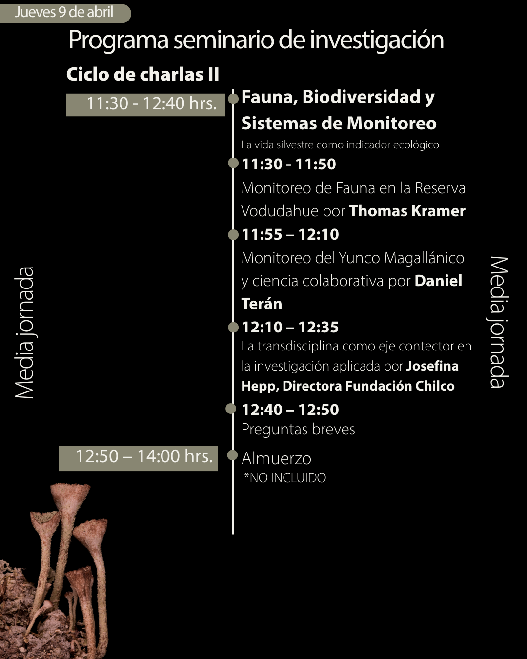 Se desarrollará entre las 11:30 y las 12:40 horas y abordará la importancia de la vida silvestre como indicador ecológico. En este bloque participará Thomas Kramer con su charla sobre monitoreo de fauna. Luego, Daniel Terán, de la Red de Observadores de Aves y Vida Silvestre de Chile, presentará la charla “Monitoreo de yunco magallánico y ciencia colaborativa”. Para cerrar esta sección, Josefina Hepp, directora de Fundación Chilco, expondrá “La transdisciplina como eje conector en la investigación aplicada”.