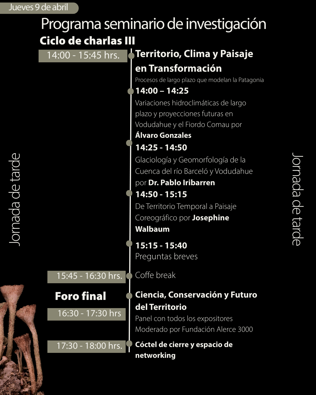 La jornada finalizará a las 16:30 horas con este foro, instancia que reunirá a todos los expositores en un panel moderado por Fundación Alerce 3000. Este espacio busca promover el diálogo en torno a los desafíos actuales de la investigación y la conservación en el sur de Chile. Además, cada ciclo de charlas contará con momentos de preguntas para fomentar la conversación entre los asistentes y los investigadores.